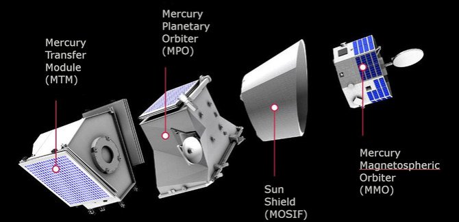Además de los panales solares, incluye dos módulos científicos que se moverán en órbitas polares: el Orbitador Planetario a Mercurio (MPO o ‘Bepi’) de la ESA, con 11 instrumentos y que orbitará a entre 480 y 1500 km de la superficie; y el Orbitador Magnetosférico de Mercurio (MMO o ‘Mio’) de la JAXA con otros cinco instrumentos que operarán a entre 590 y 11.640 km de altura, y que viajará protegido por un escudo solar (MOSIF). Por su parte, el denominado Módulo de Transferencia a Mercurio (MTM), construido también por la ESA, transportará los otros componentes hasta el planeta empleando una combinación de propulsión solar-eléctrica y maniobras de asistencia gravitatoria. La nave también incorpora una 'selfiecámara' que tomará imágenes destinadas al gran público.
